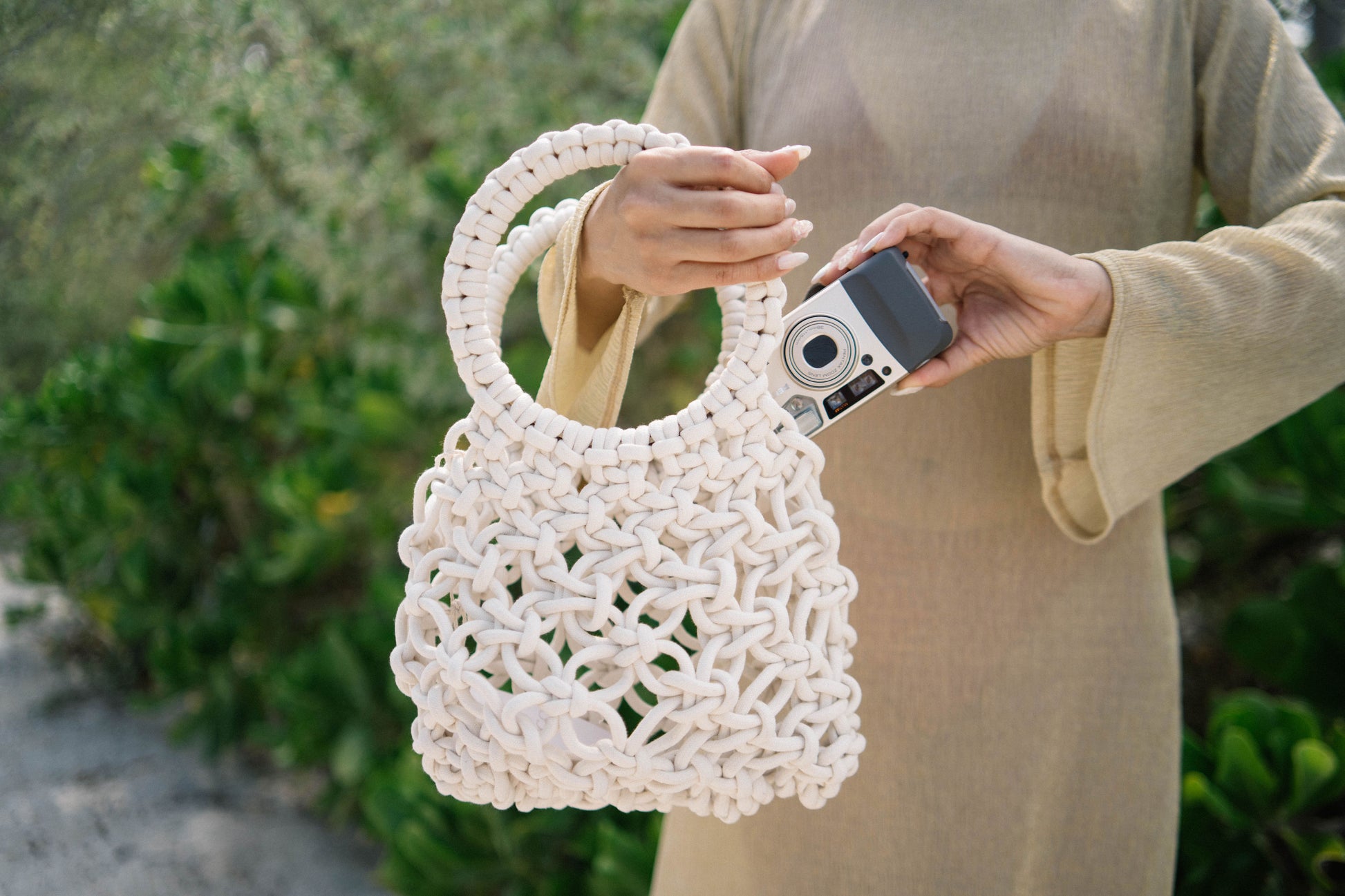 Bolsa de macramé hecha completamente a mano con hilaza de 100% algodón, con asa circular de bambu forrada en la misma hilaza de algodón.